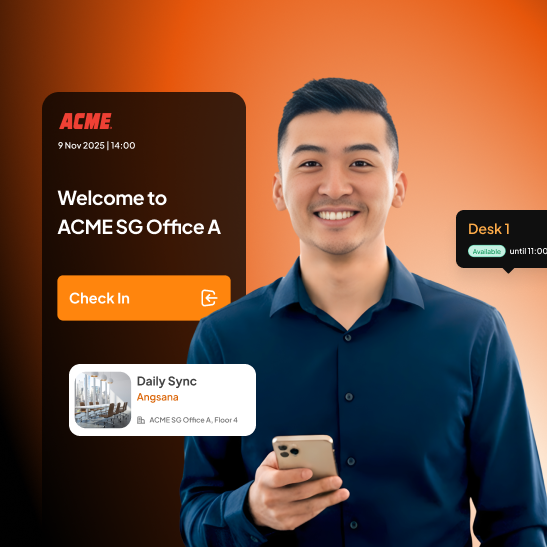 Employees book rooms and desks in seconds from their phone. Visitors check in seamlessly. All in one seamless flow.