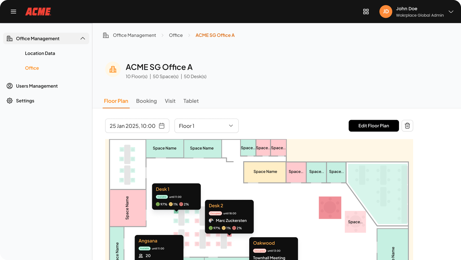 Athena Workplace Management empowers employees and visitors with frictionless room and desk booking, visitor check-in, floor plan navigation, and AI-powered space recommendations.
